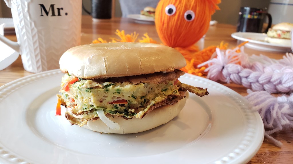 Comience el proceso de ensamble, tome un poco de queso piladelphia con un cuchillo para untar o cualquier otro utensilio que sirva para ese propósito y unte una cantidad a su gusto de queso en la parte baja del bagel, después ponga su tarta de huevo y cierre con la parte superior del baguel.